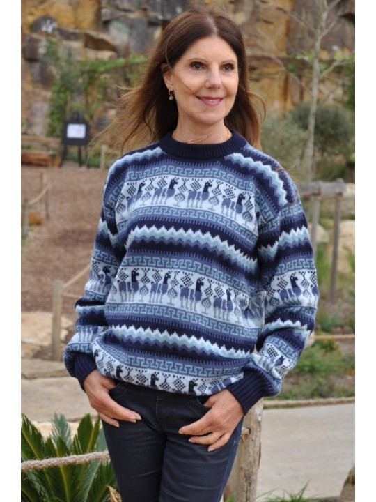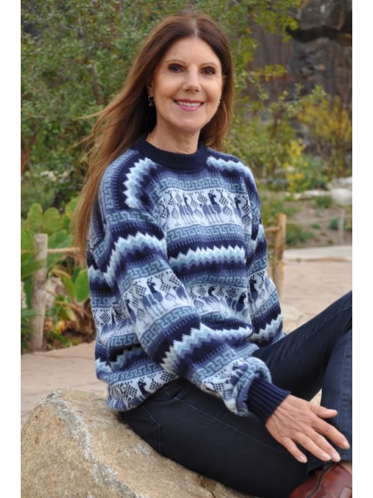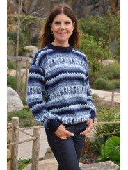 Pull jacquard aux motifs et dessins originaires des Andes sud-américaines, encolure ronde et manches longues.