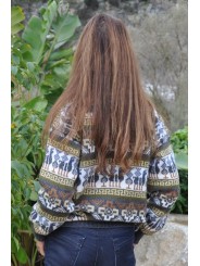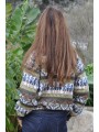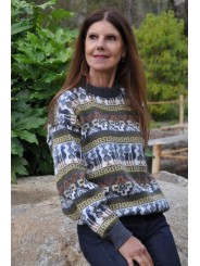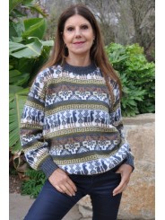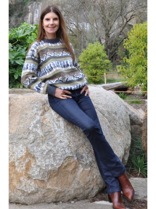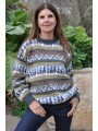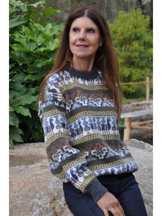 Finitions soignées pour ce pull pour femme en col rond,  tricoté dans une maille fine et décoré de dessins géometriques, motifs péruviens.