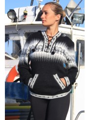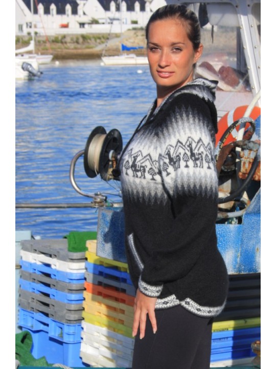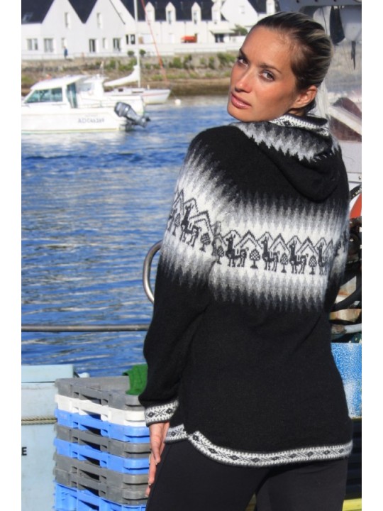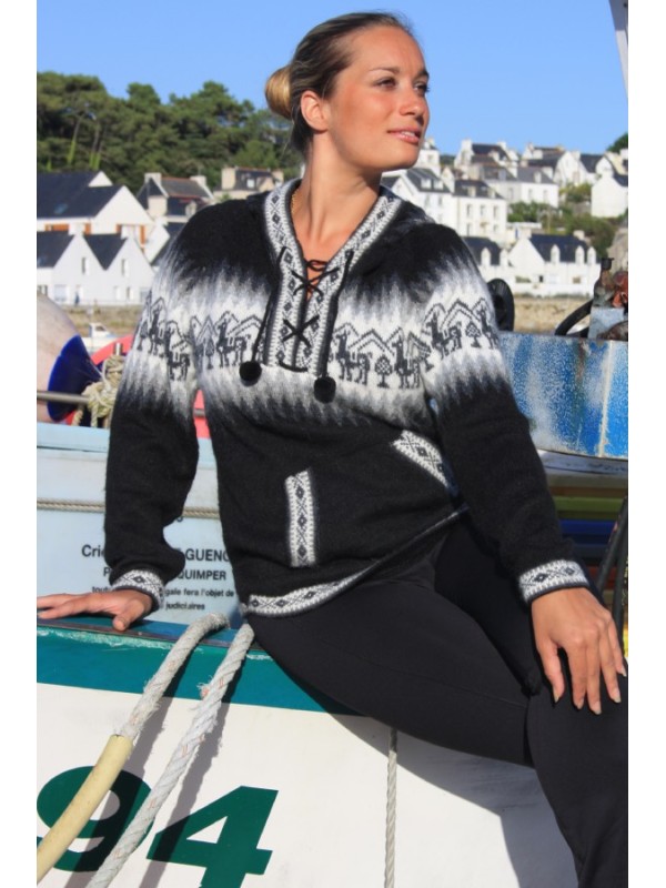 Ce pull-over péruvien pour dame offre de belles finitions : capuche et col décontracté de coupe ample en fin mélange de laine vierge d'alpaga et acrylique.